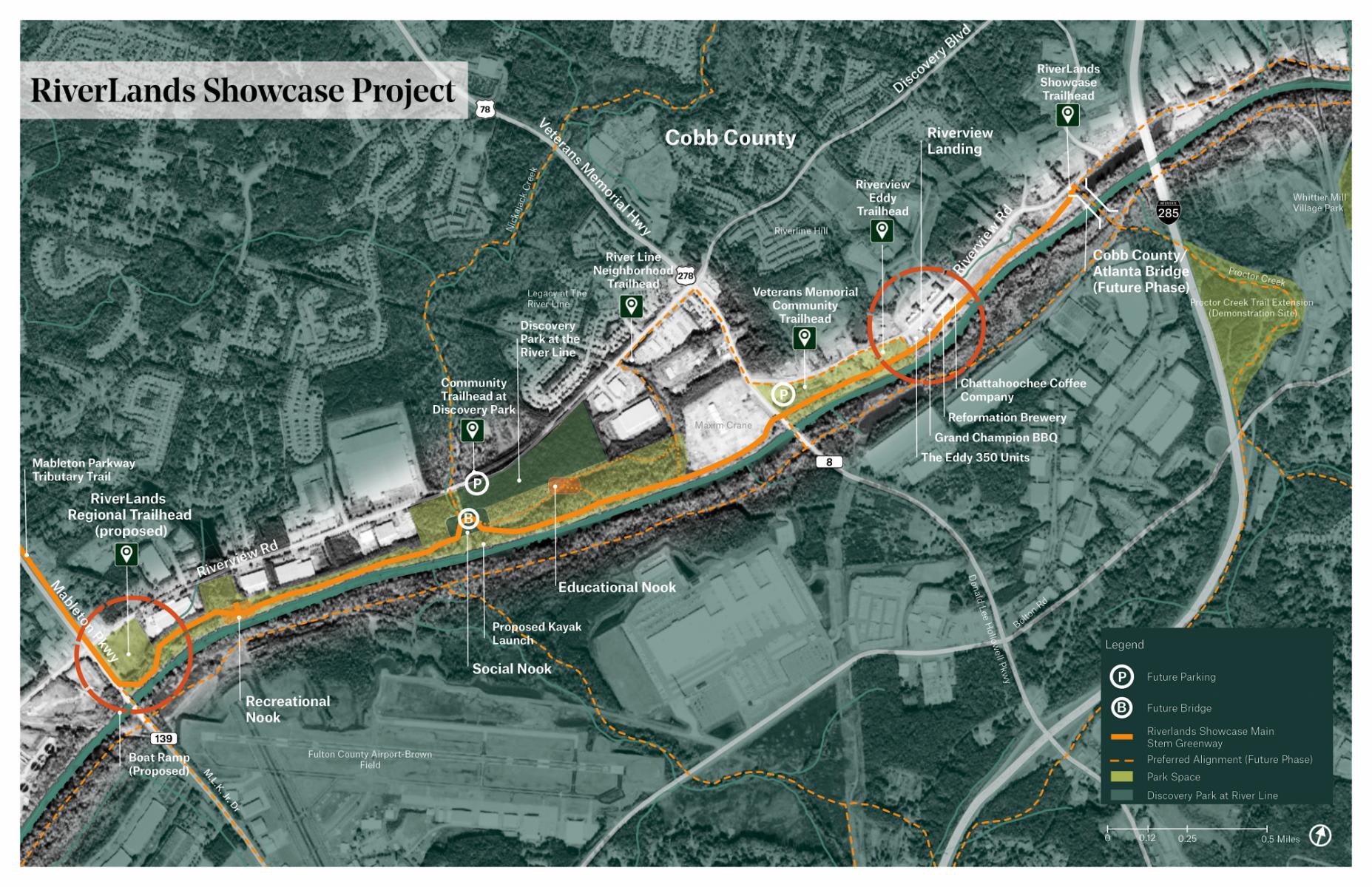Strategically located at Mableton Parkway and Discovery Boulevard, the Chattahoochee Gateway Park is repurposing a former industrial site into an energetic community hub. The park will feature extensive walking and biking trails, lush green spaces, and various amenities catering to all ages. This development will become a central gathering place for Mableton, providing a serene environment for relaxation, exercise, and immersion in nature.